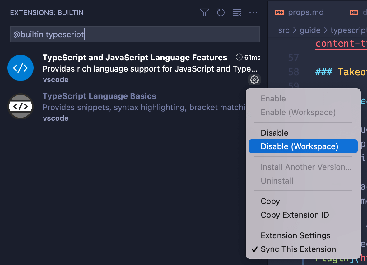 4. "TypeScript and JavaScript Language Features" の小さい歯車のアイコンをクリックし、"Disable (Workspace)" を選択してください。
